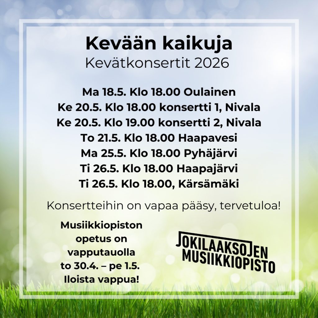 Jokilaaksojen musiikkiopiston kevätkonsertit järjestetään paikkakunnittain alla olevan listan mukaisesti. Lisää infoa konserteista Meillä tapahtuu – konserttisivustolla (linkki sivulle).