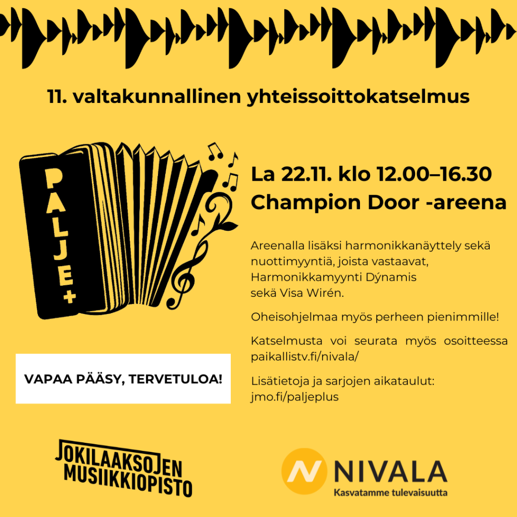 Palje+ yhteissoittokatselmus lauantaina 22.11.2025 klo 12-16.30 Champion Door -areenalla, Nivalassa. Vapaa pääsy, tervetuloa!