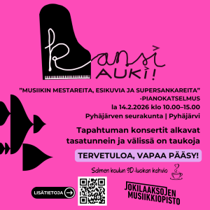 Lauantaina 14.2.2026 klo 10.00-15.00 ”Musiikin mestareita, esikuvia ja supersankareita!” -pianokatselmus Pyhäjärven seurakuntakeskuksella.