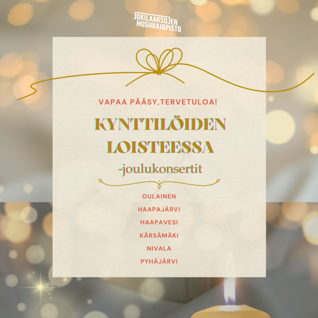 Tervetuloa JMO:n joulukonsertteihin! Konsertteihin on vapaa pääsy.🎄OULAINENTi 9.12. klo 18Merkuriussali🎄HAAPAJÄRVIKe 10.12. klo 19Seurakuntakoti 🎄HAAPAVESI To 11.12. klo 18 Haapaveden kirkko🎄KÄRSÄMÄKITi 16.12. klo 18Frosteruksen koulun auditorio🎄NIVALAKe 17.12. klo 18Saalastinsali🎄PYHÄJÄRVITo 18.12. klo 18Pyhän Ristin kirkko